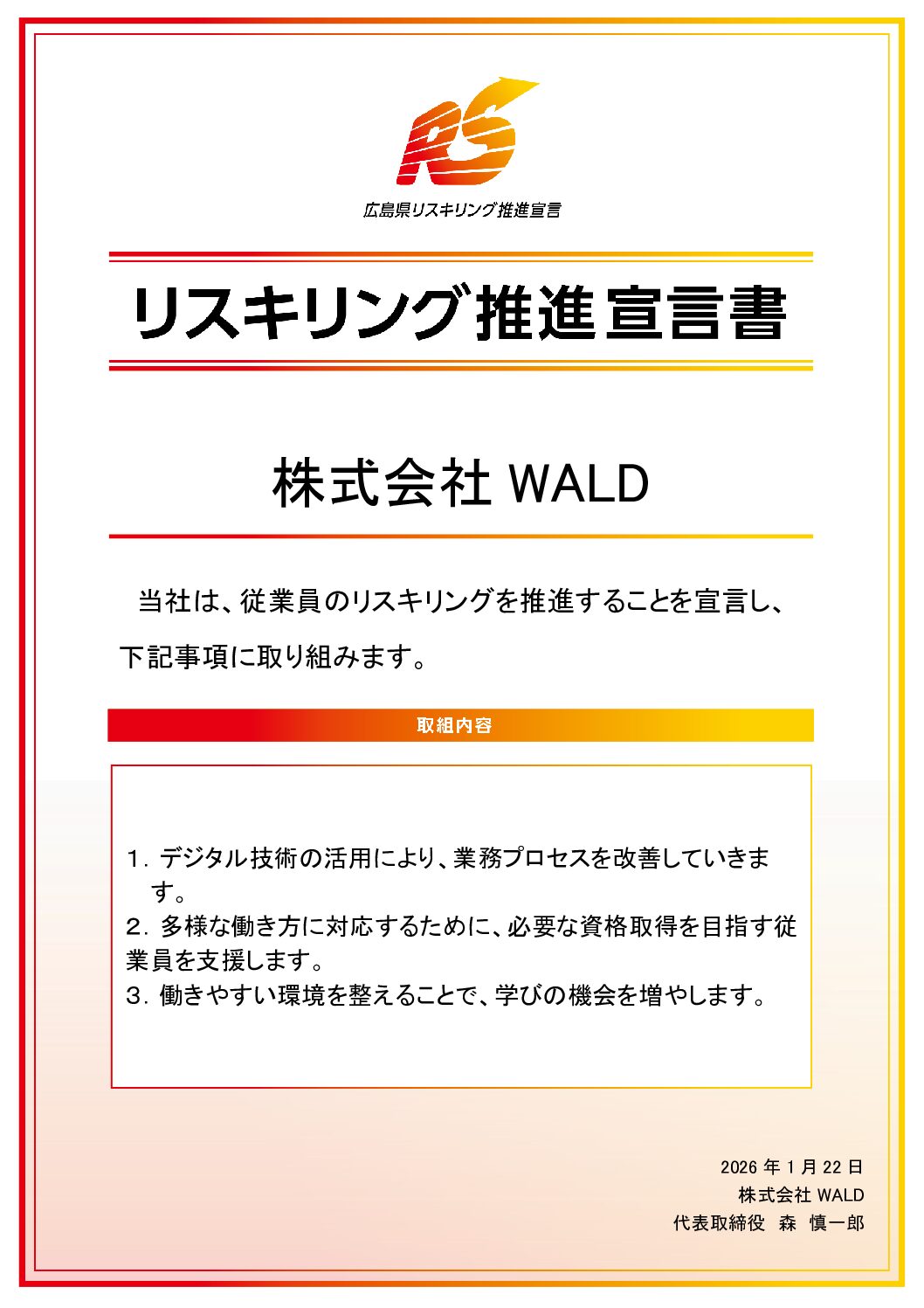 この度、弊社グループ会社の株式会社WALDにて、 本社、森電設株式会社同様に新たな業務に必要となるスキルや知識を習得するための支援策として、「リスキリング推進宣言書」を策定いたしました。